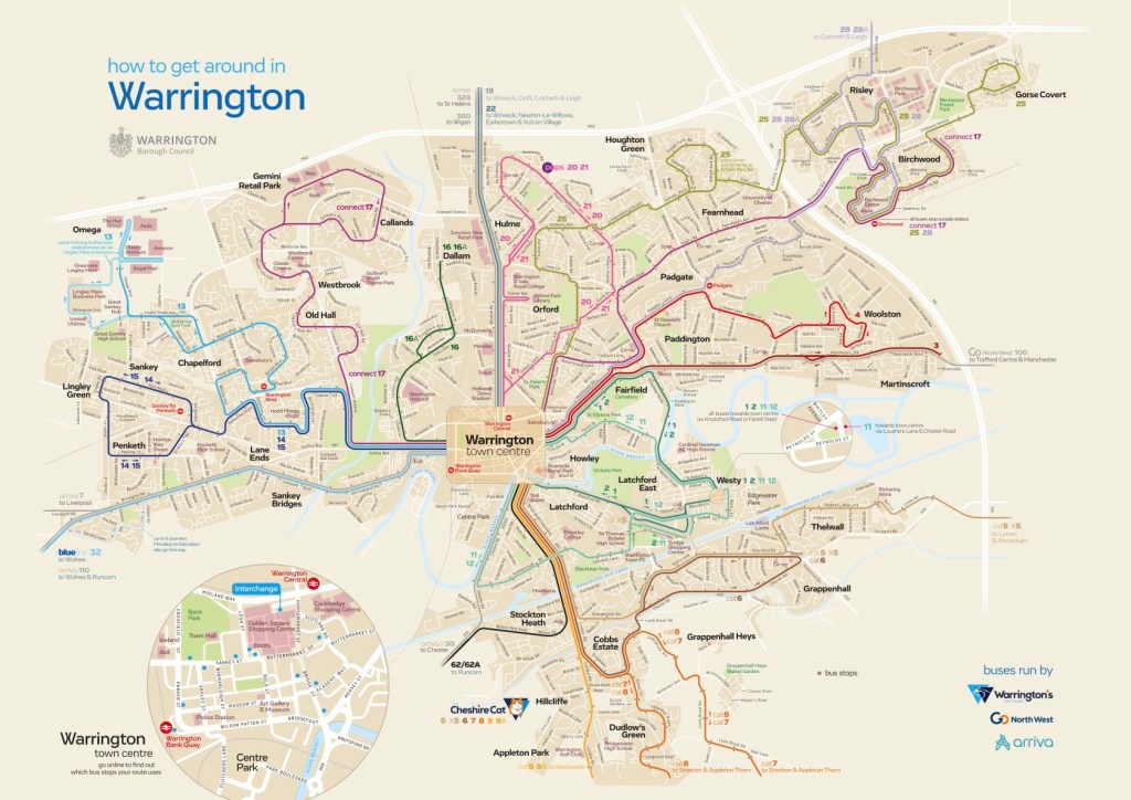 Warrington is also a point where the Merseytravel and Cheshire bus worlds meet. Though it isn’t officially within Merseyside, Merseytravel timetables and tickets are visible and accepted on a number of services, especially those connecting to St Helens, Widnes, Runcorn, and Liverpool.