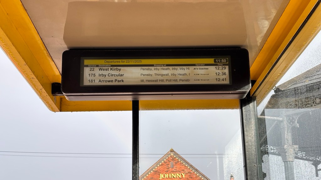 I’ve observed that all bus stations around Merseyside have displays at each bus stop. It would be great if all bus stops around the Wirral and in Liverpool had these as well, so we could know when the next bus is arriving and how far away it is. Currently, this information is only available at bus stations like Queen Square, Liverpool One, and Birkenhead Bus Station. It would be beneficial to have these displays at regular bus stops with shelters.