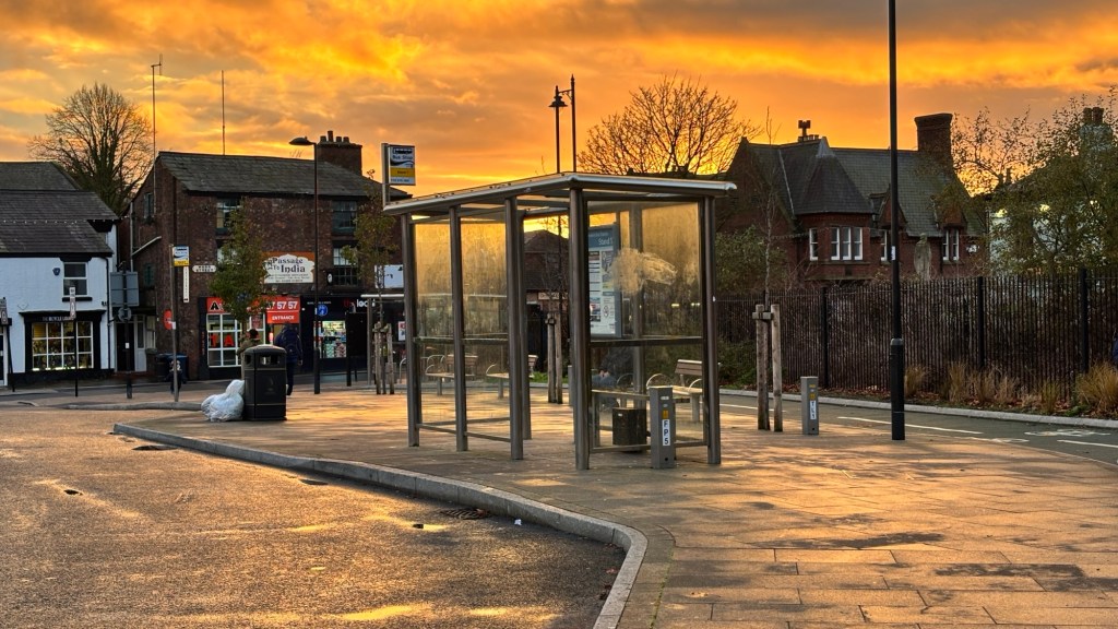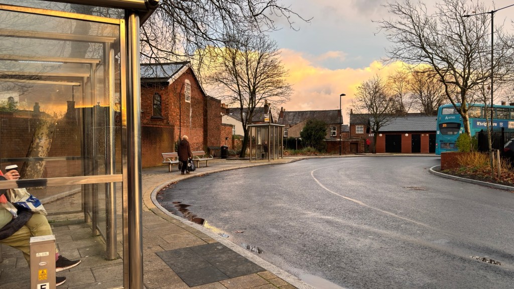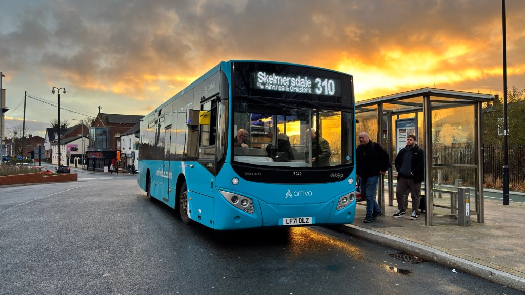 The sunset at the time I arrived at Ormskirk Bus Station was absolutely breathtaking. I captured some lovely sunset photos of the bus stop and the Evora heading to Skelmersdale on the 310, operated by Arriva North West. I had planned to visit Skelmersdale this time, but the bus was so late arriving into Queen Square that by the time I reached Ormskirk, it was 19 minutes late. The bus was originally due in at 15:33.