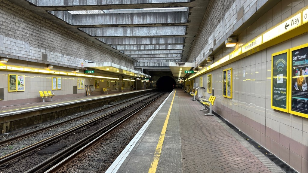Starting from Birkenhead Park, I travel one stop to Conway Park, which opened in 1998 and is now 27 years old. Despite its age, it still looks great and is one of my favourite stations on the Wirral line from Hamilton Square. I admire the architecture, particularly the massive pillars supporting the sides of the station—it looks so cool! Even though it’s underground, the open roof gives the feeling of being outside. From Conway Park, I continue to my next station, Moreton.